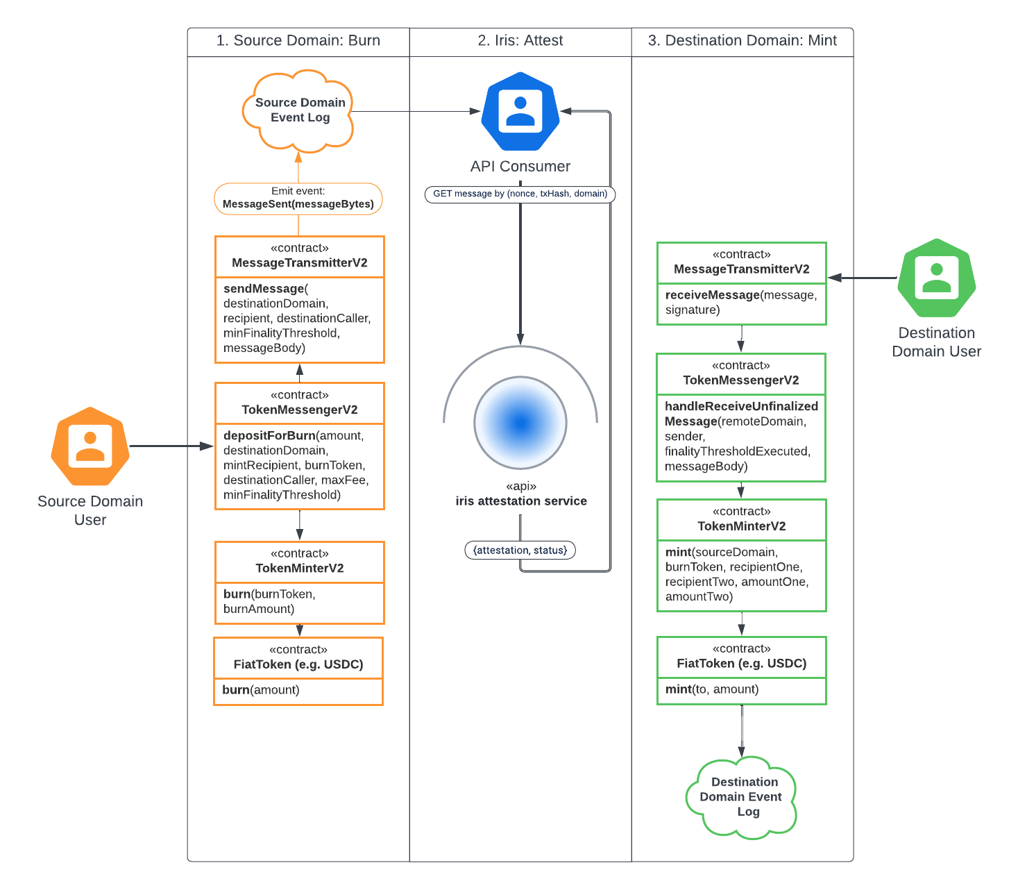 The relationship between CCTP V2’s onchain components and Circle’s offchain Attestation Service is illustrated below for a burn-and-mint of USDC between EVM-compatible domains: