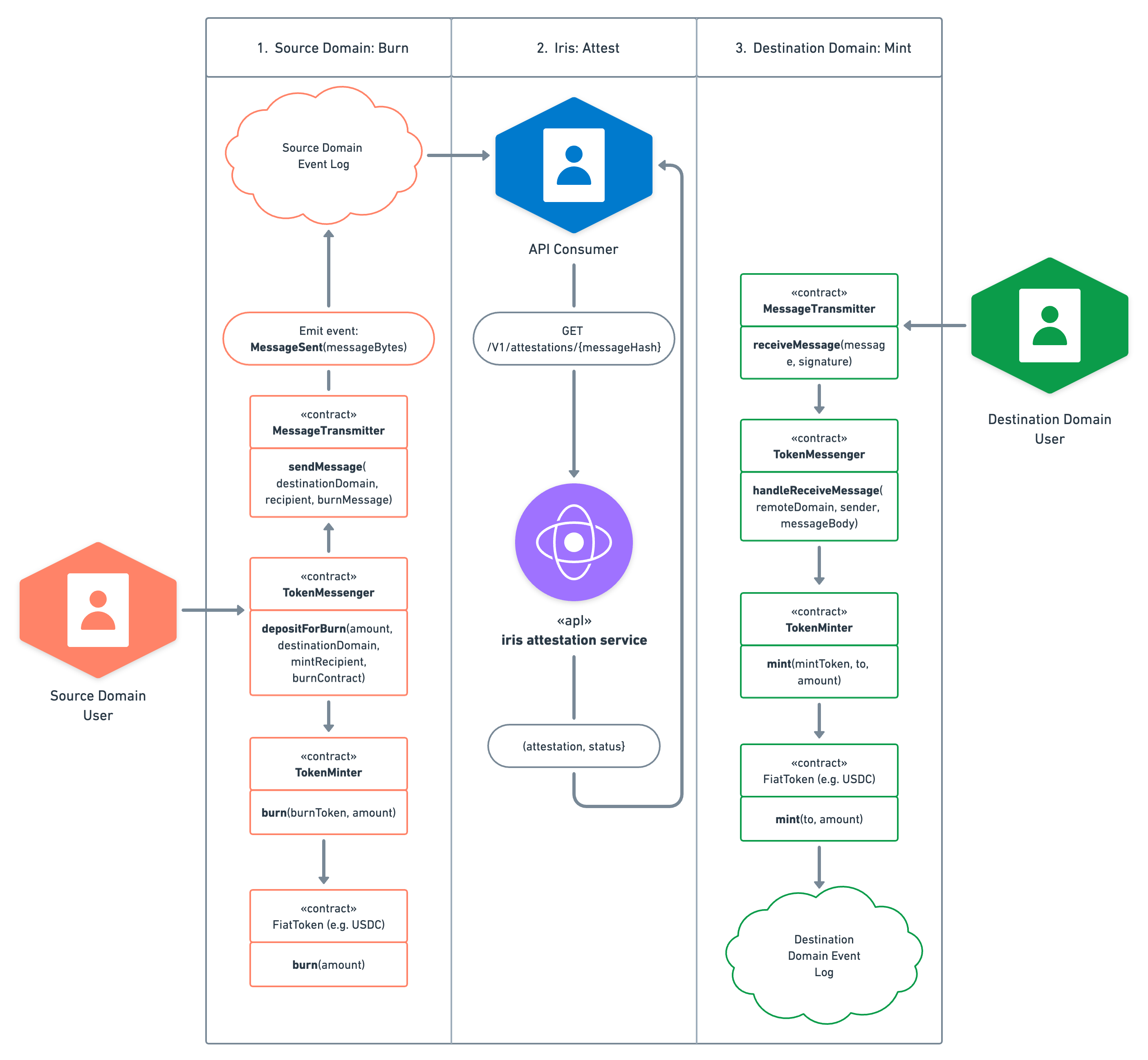 The relationship between CCTP V1’s onchain components and Circle’s offchain Attestation Service is illustrated below for a burn-and-mint of USDC between EVM-compatible domains: