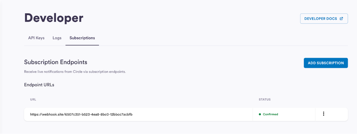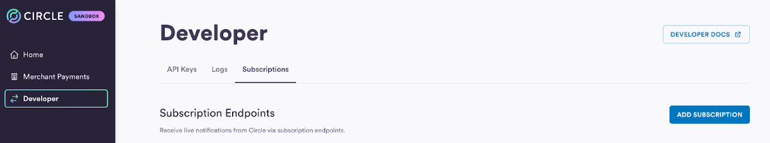 Now that you have a publicly accessible endpoint, you need to register your endpoint as a subscriber to webhook notifications by doing the following:- Navigate to Developer > Subscriptions in your Circle Mint account and click Add Subscription.
