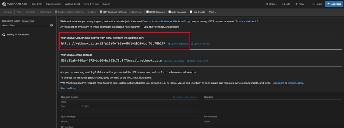 Your unique URL (Please copy it from here, not from the address bar!) https://webhook.site/83fa21a0-f00a-4673-bb50-bcf62c78b1f7Your unique URL: