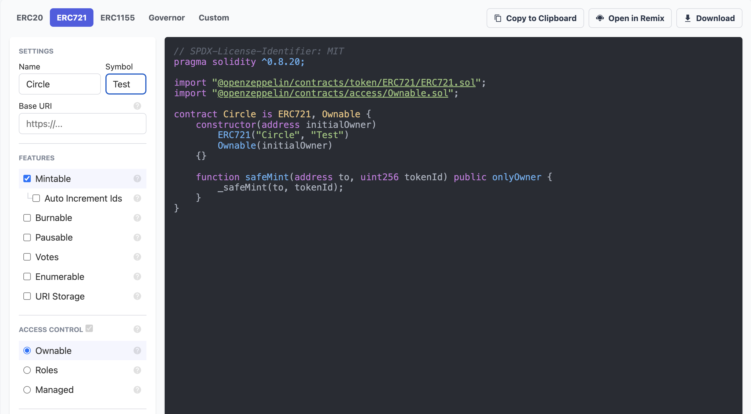 - Select the ERC-721 template and the additional features you want to add to your contract.