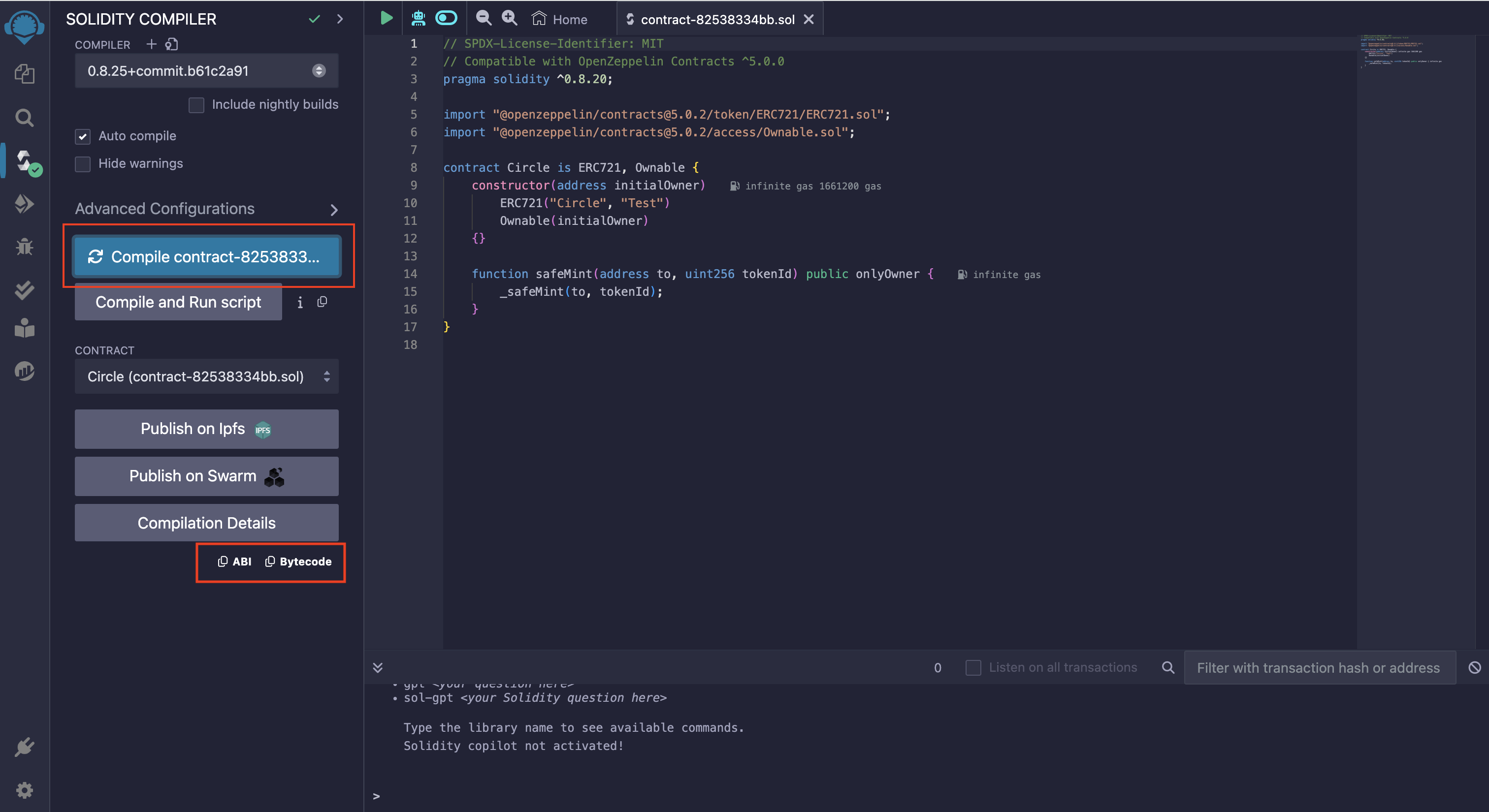 - Once the compilation is complete, note down the ABI and bytecode. These