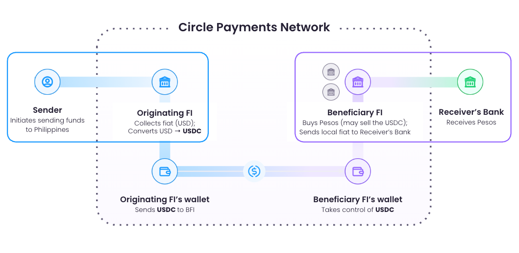 - Circle Payments Network (CPN): Orchestration layer that aggregates financial institutions, vets participants, and facilitates money movement through onchain and offchain services.