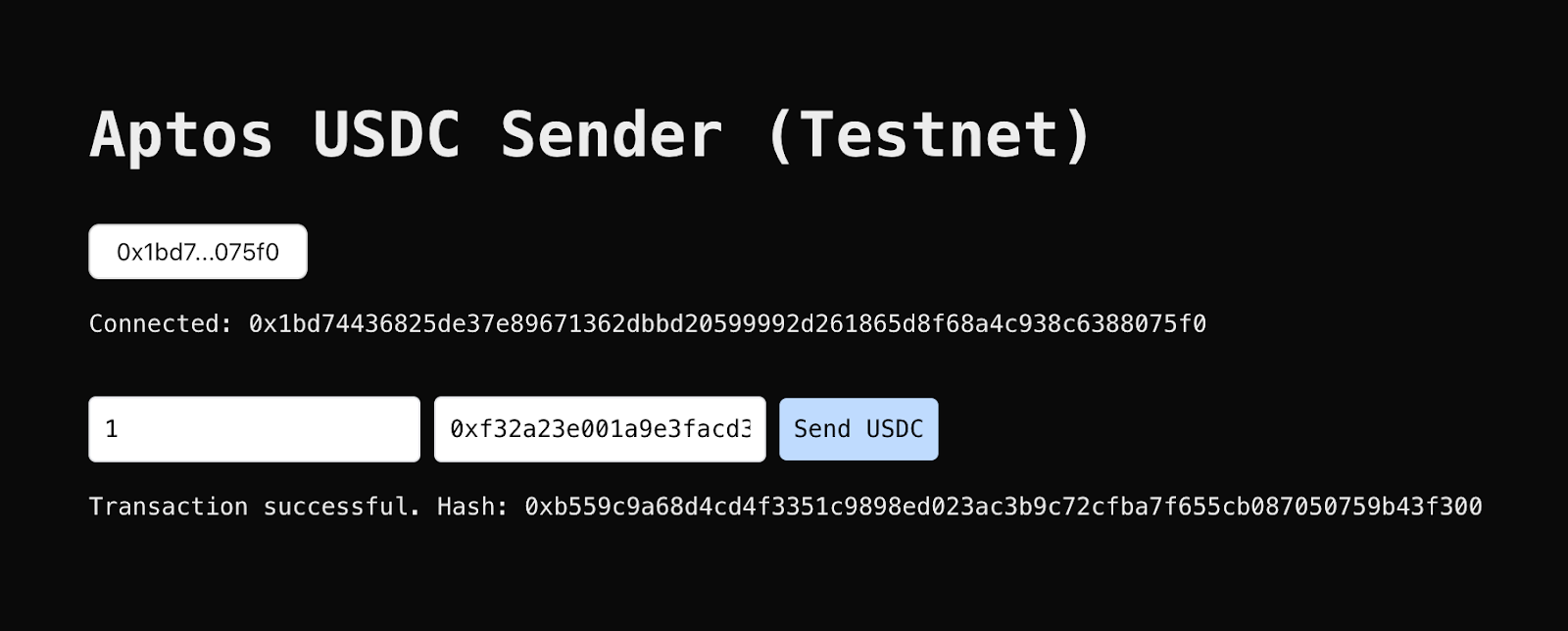 Request testnet Aptos Tokensfrom your Aptos Wallet to source gas tokens. - In the app, enter the amount of USDC you want to send and the recipient’s address.