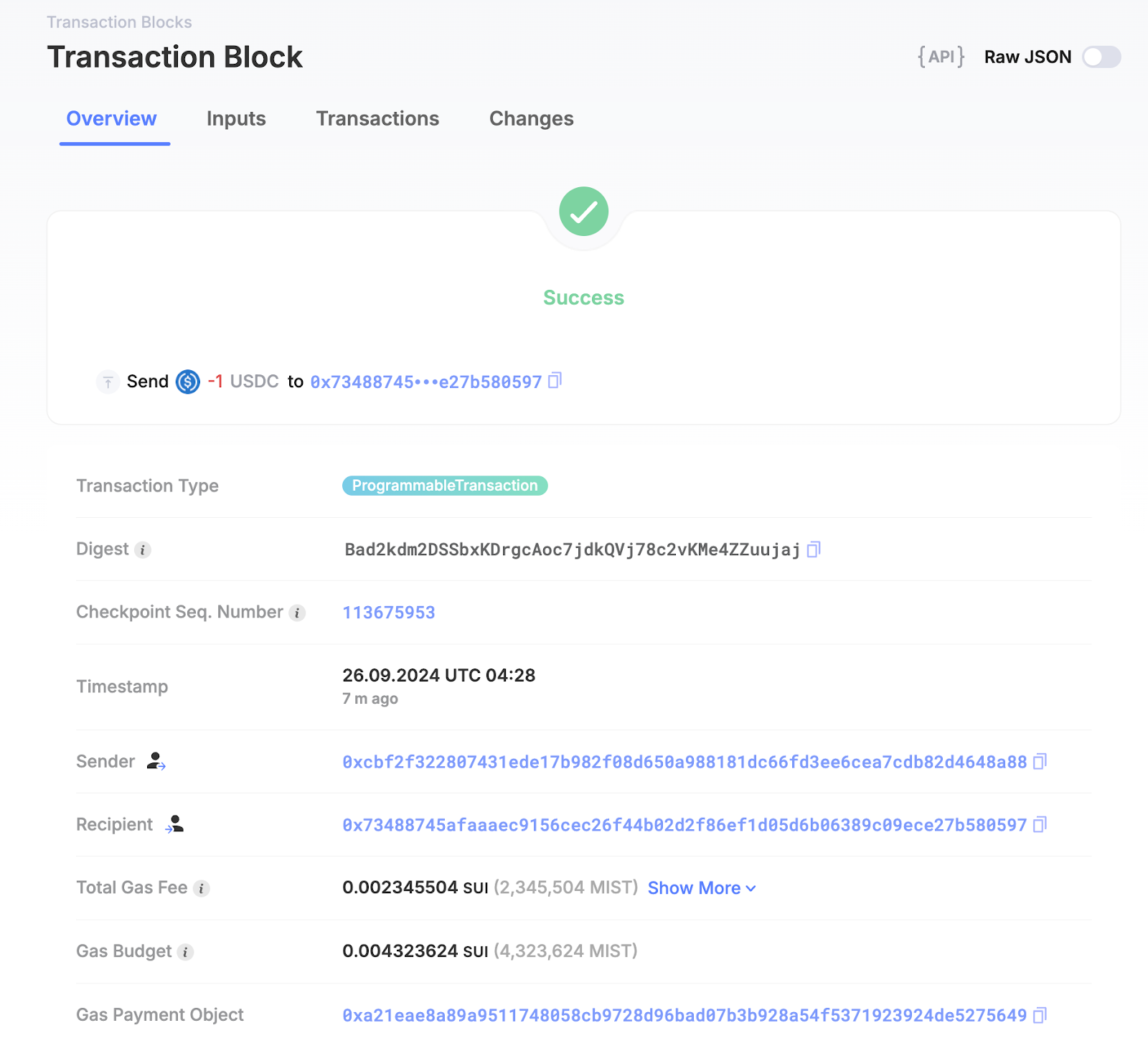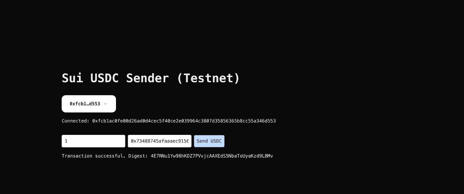 Request testnet SUI Tokensfrom your Sui Wallet to source gas tokens. - In the app, enter the amount of USDC you want to send and the recipient’s address.