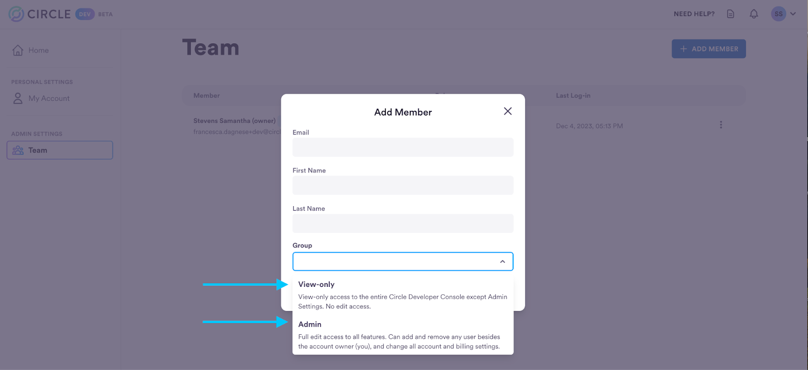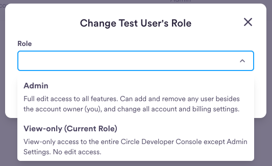 Enter the new user information, including email address, first name, and last name. Select View-only or Admin to set the new user’s permissions. Select Send Invite.Email addresses must be unique across accountsAn email address that is invited must be unique across Circle accounts. If you