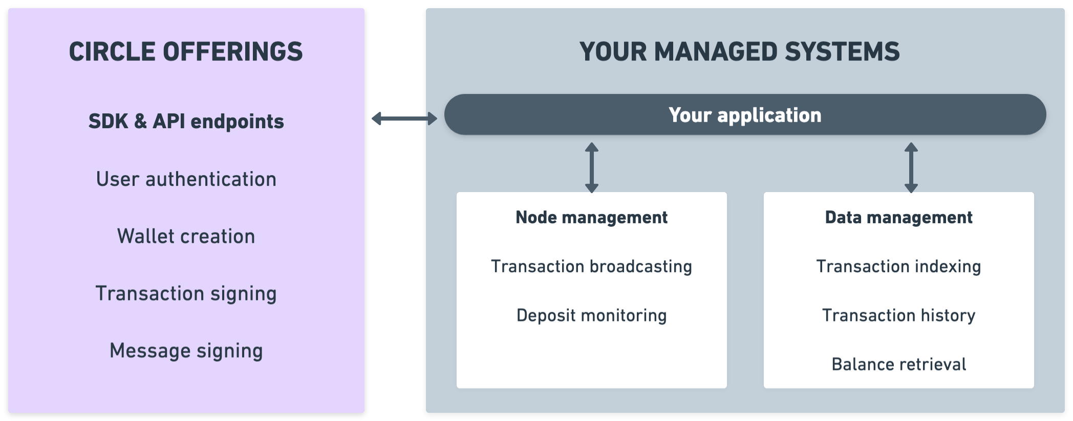 | Wallet Features | User authentication Wallet creation Full transaction lifecycle management: - Signing tx or messages - Broadcast - Monitor deposit - Index tx and balances | User authentication Wallet creation Signing tx or messages |