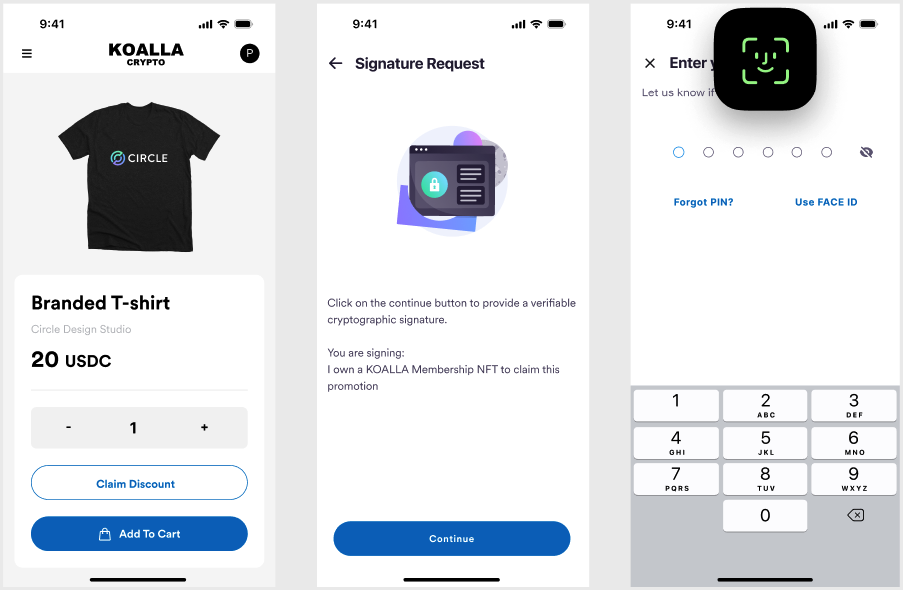 | PIN | Prompts users to set up a PIN and answers to security questions. | Circle does not provide UIs for transaction details. After previewing a signature or transaction, users confirm authorization by inputting a PIN or through biometrics, if enabled. | Users are required to set up a PIN code to authorize transactions. They have sole access to their private keys, which ensures privacy and prevents unauthorized access or movement of assets |