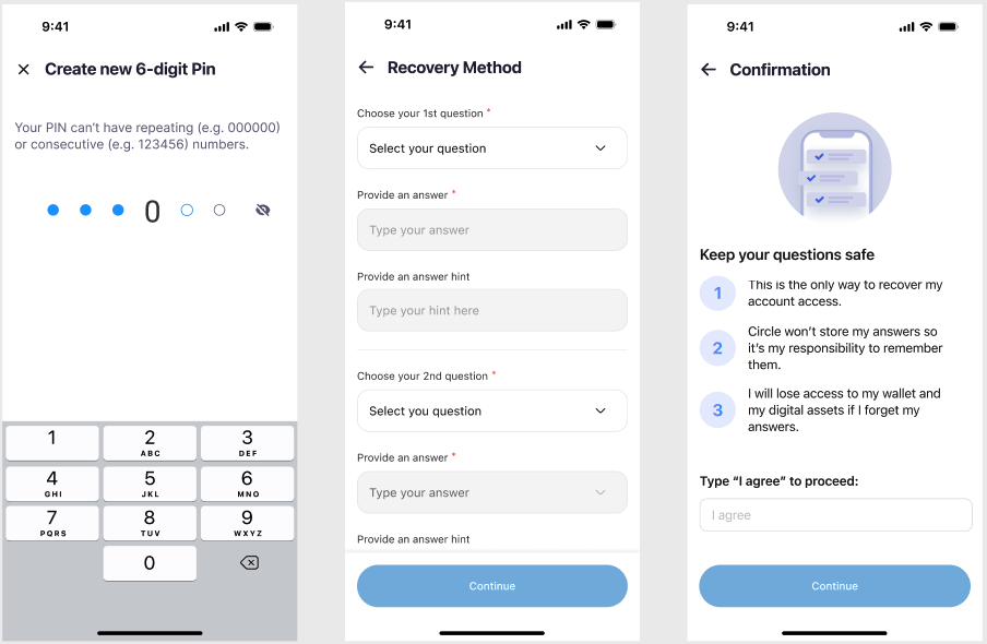 When signing up for your application, users set up answers to security questions after they specify their PIN. These answers are used in the wallet recovery process. If users lose or lock their PIN, they can unfreeze their wallets by going through the recovery process. They must answer their chosen security questions correctly. If the user incorrectly answers security questions more than three times, the recovery process locks for 30 minutes. The following example UX screens show how users can specify a PIN and recovery method during the onboarding process for your application.