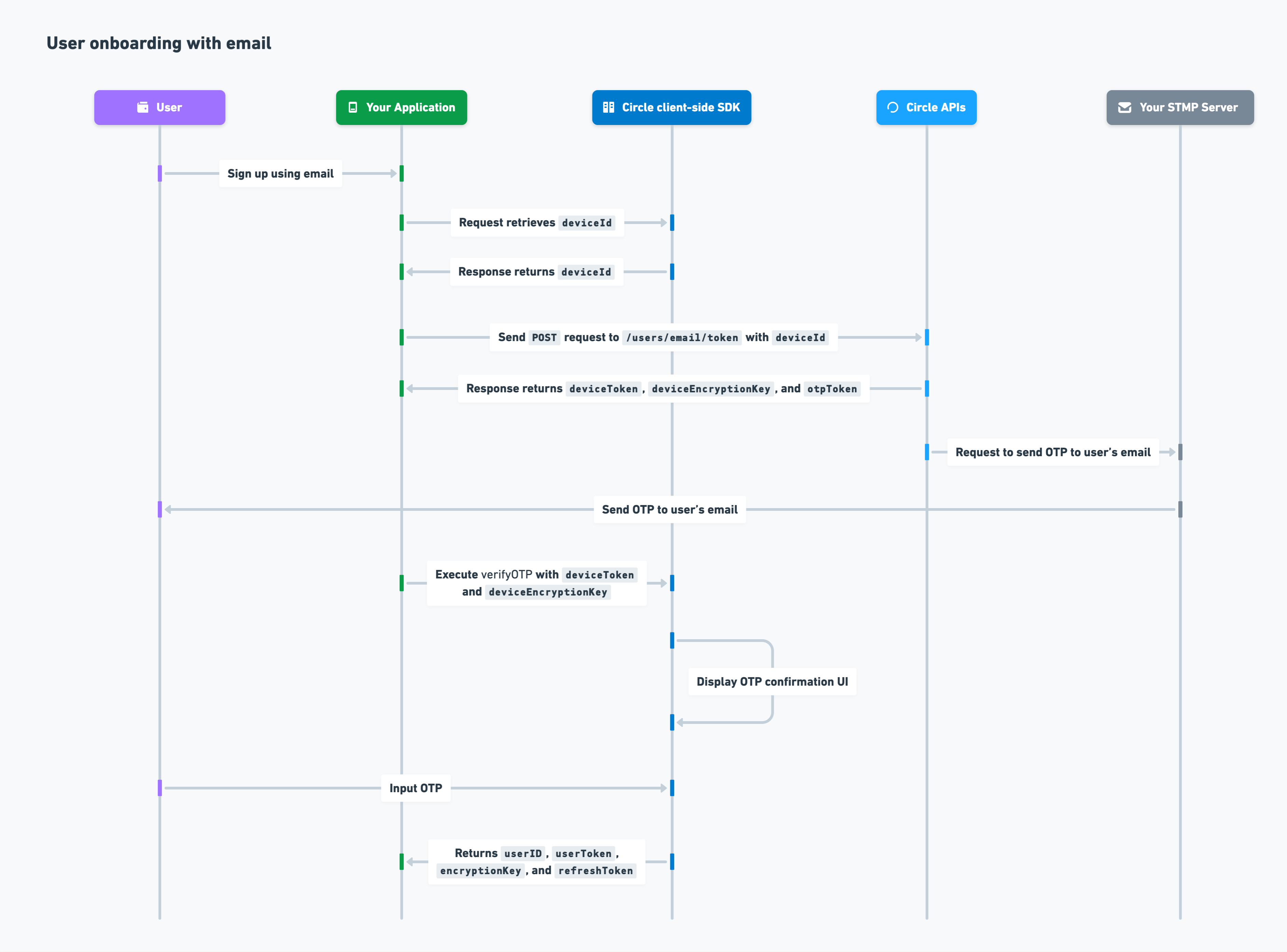 otpToken,deviceToken, anddeviceEncryptionKeyin the response. - Circle requests your SMTP server to send an OTP email to your user’s email.