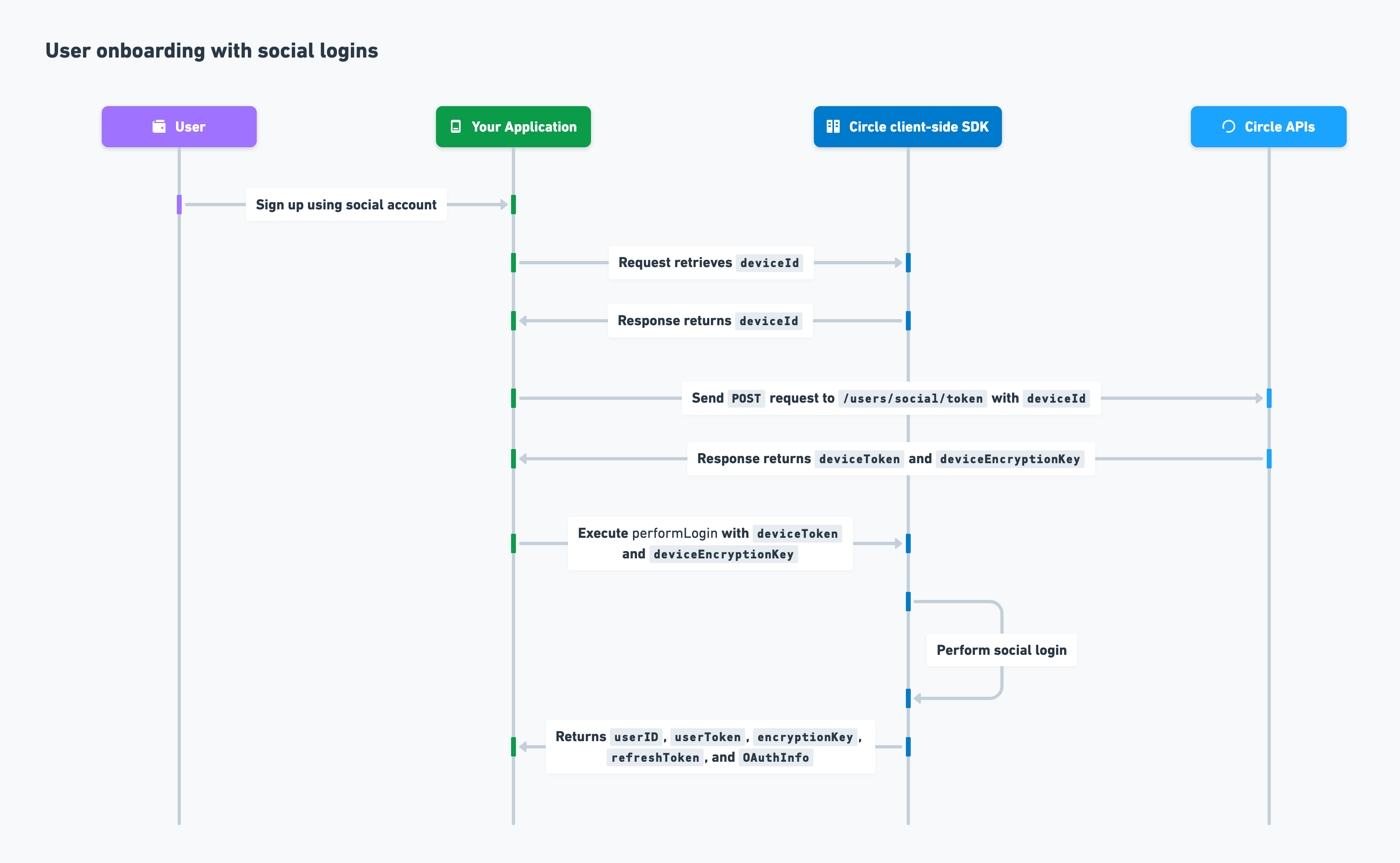 performLoginwithdeviceTokenanddeviceEncryptionKeyprovided. - Circle executes the Social login flow and returns