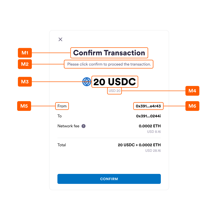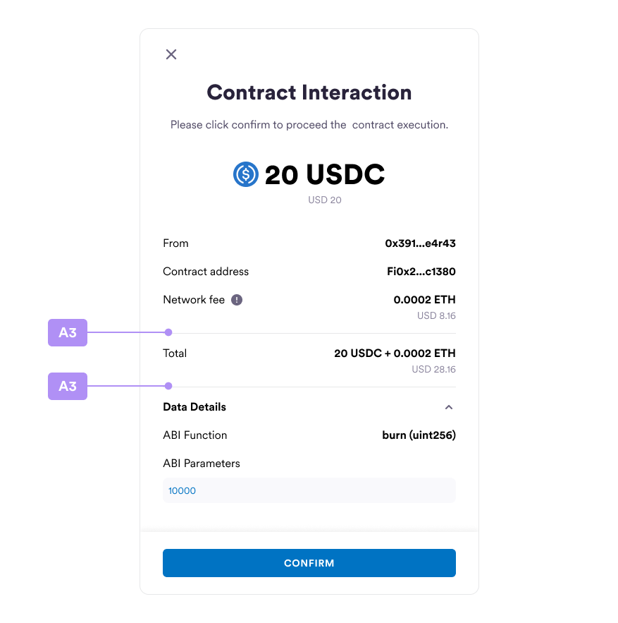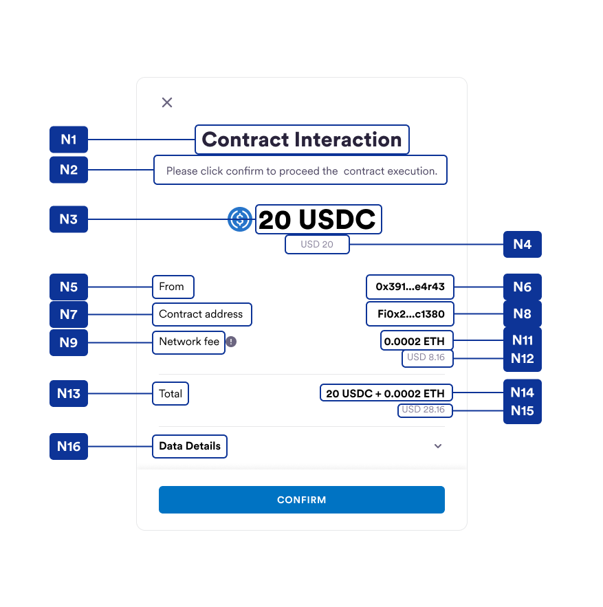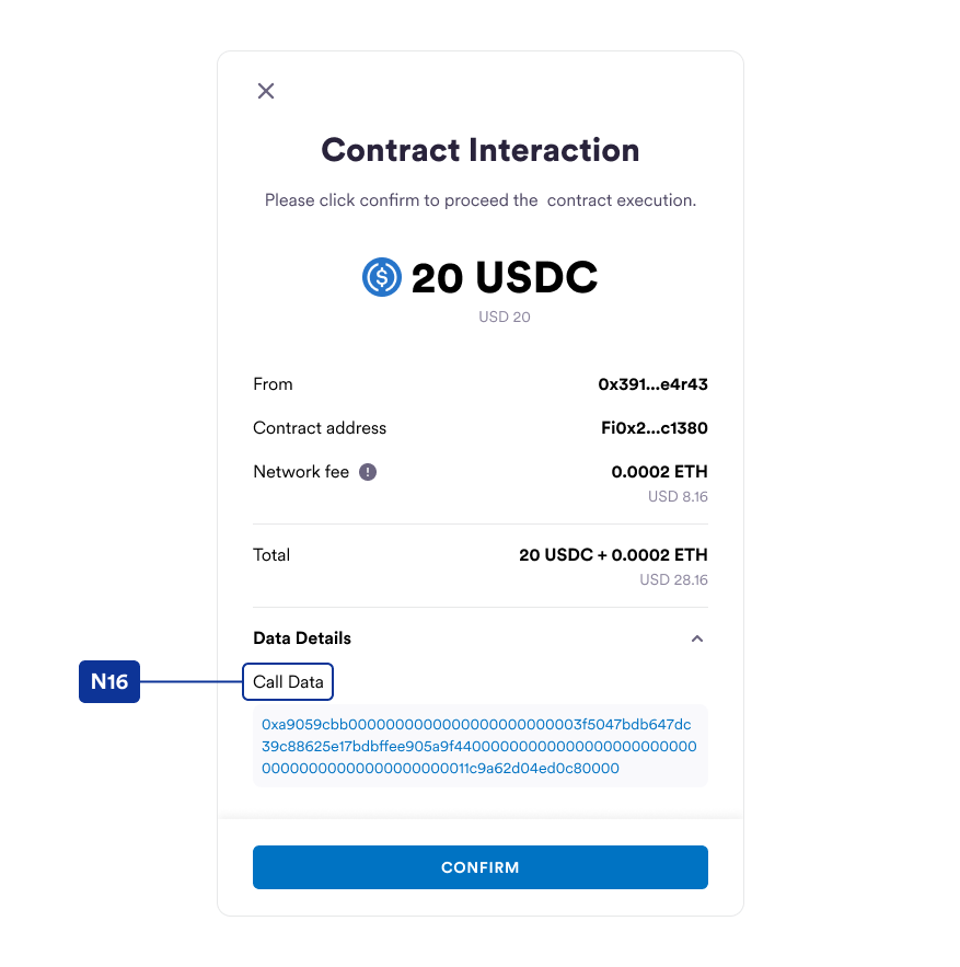 | N16 | dataDetails | An object for contract interaction data detail display. { dataDetails?: { dataDetailsLabel?: string callData?: { callDataLabel?: string data?: string } abiInfo?: { functionNameLabel?: string functionName?: string parametersLabel?: string parameters?: string[] } } dataDetailsLabel: data details label callData or abiInfo: The use could choose either one to fill up depending on the transaction can be parsed by abi (choose abiInfo) or not (choose callData) |