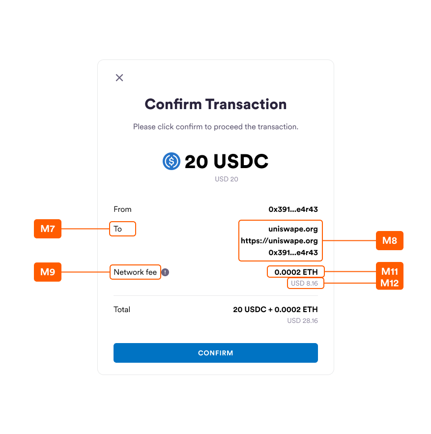 | M11 | networkFee | Network fee value E.g. 0.005 ETH |
