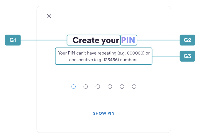 | G1 | headline | Headline text Keep the placeholder like this: E.g. `Enter your {{pin}}` or `輸入你的 {{pin}}` |