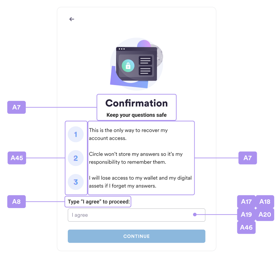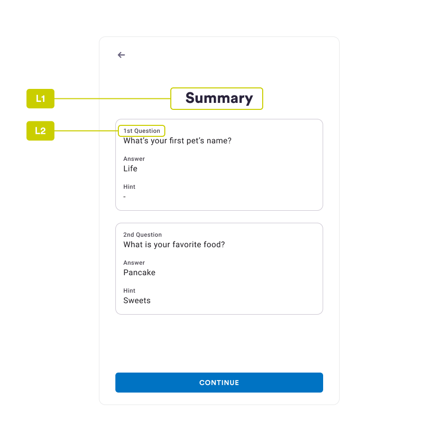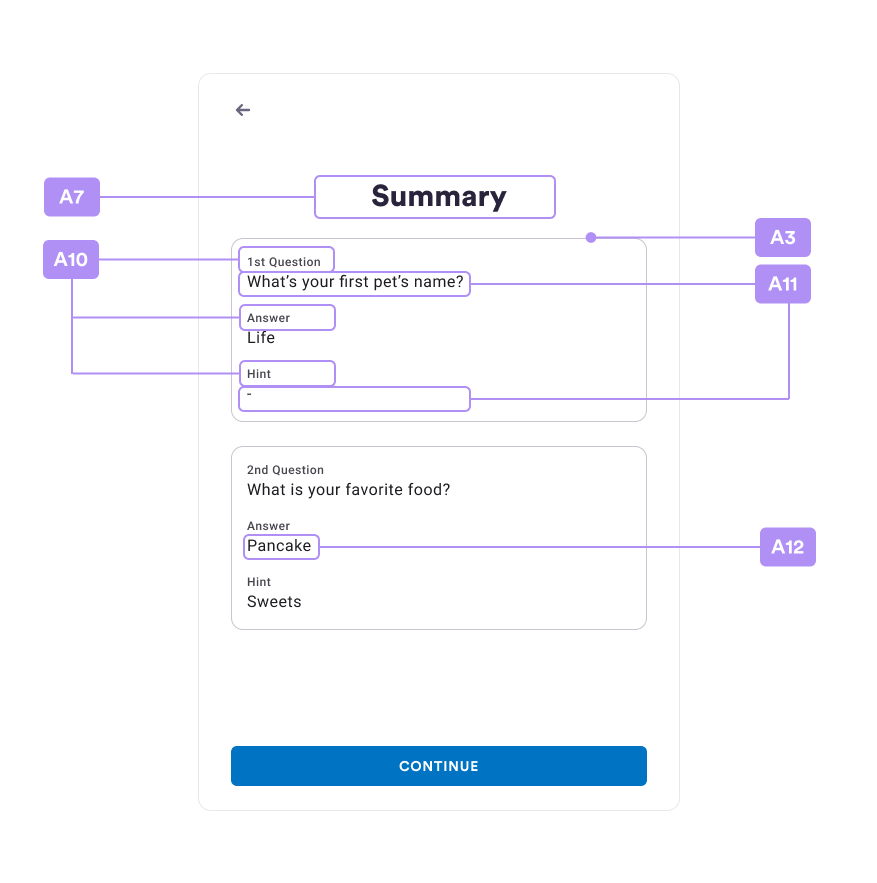| B3 | setCustomSecurityQuestions( questions?: SecurityQuestion[] | null, requiredCount = 2, securityConfirmItems?: string[]) | Set the array of customized disclaimers on the SecurityConfirm screen. The value is undefined by default. |