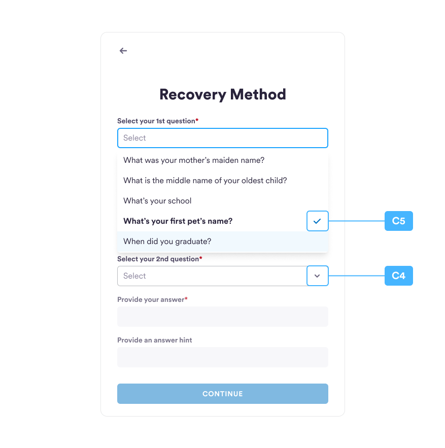 | B2 | setCustomSecurityQuestions( questions?: SecurityQuestion[] | null, requiredCount = 2, securityConfirmItems?: string[]) | Set the required count of security questions. The value is 2 by default. |